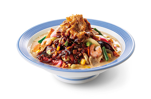 リンガーハットの代表的なメニュー「野菜たっぷりちゃんぽん」に禁断のアレンジを行いました。パンチのきいた背脂にんにく醤油と豚しゃぶを豪快にのせた商品で、たっぷりの野菜はそのまま、背徳感を味わえる今までにない食べ応え抜群のメニューです。